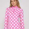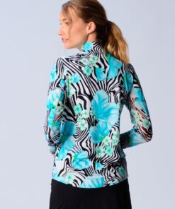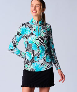Let’s break it down. The fit is contoured and flattering without feeling tight. The mock neck sits clean. The quarter zip lets you shift from warmup to match play in seconds. The Black Zebra print adds confident energy to any outfit. Subtle branding keeps the look polished.